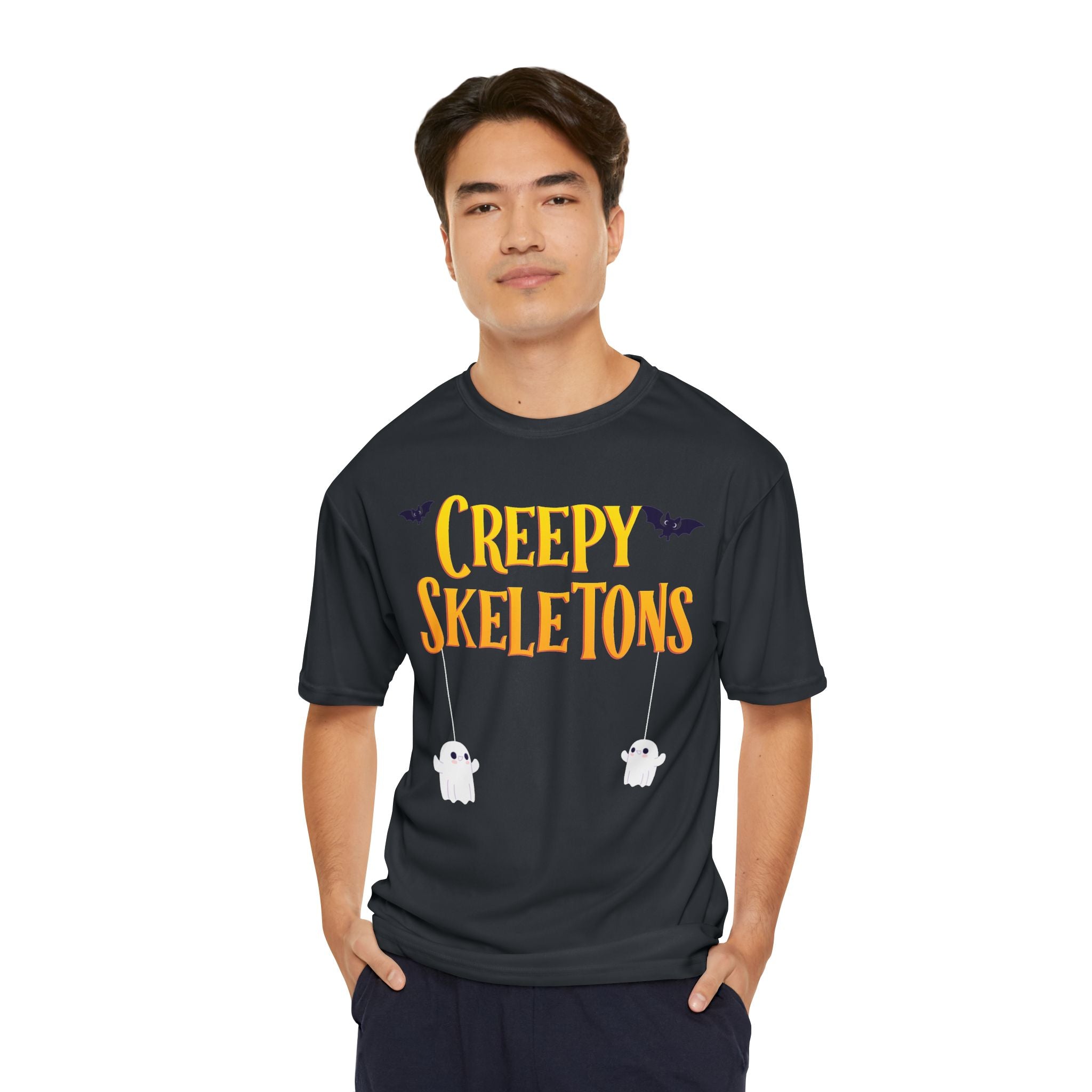 Creepy Skeletons and Mummy | Spooky Halloween Graveyard with Bats | Men's Performance T-Shirt - Black / S