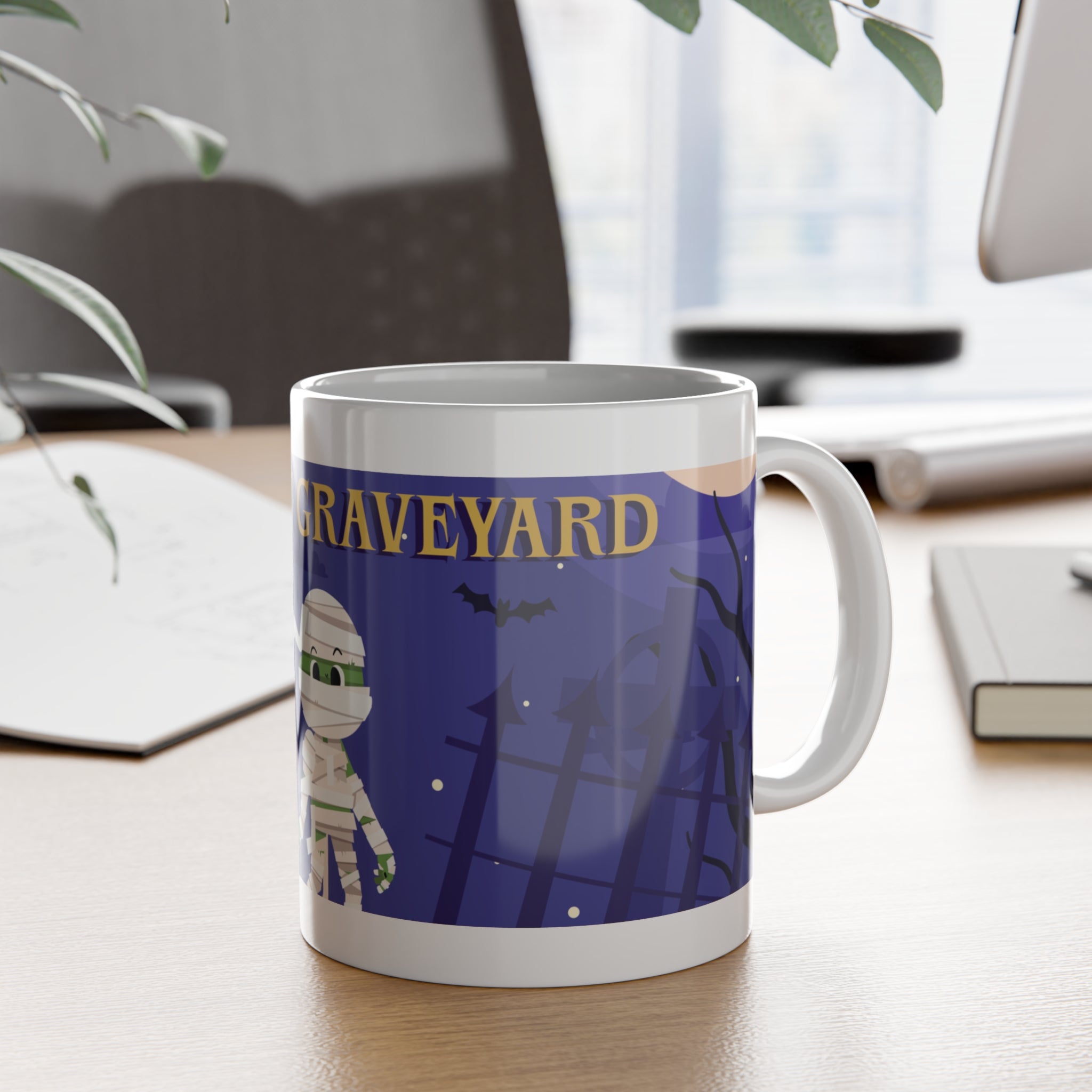 Creepy Graveyard Halloween | Mummy, Tombstone, and Full Moon | White Ceramic Mug - 11oz / White