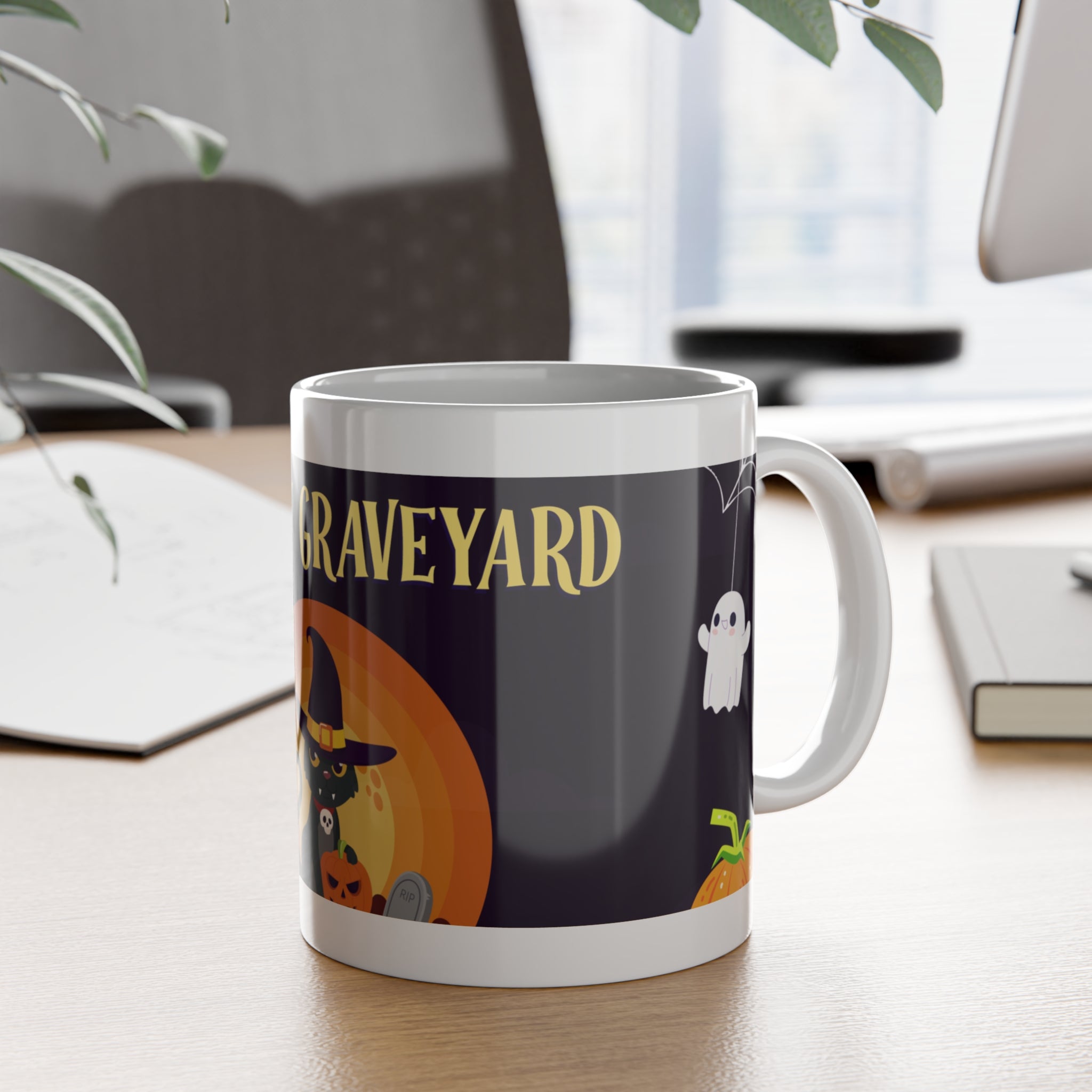 Creepy Graveyard Scene | Halloween Black Cat, Ghosts, and Pumpkins | White Ceramic Mug - 11oz / White