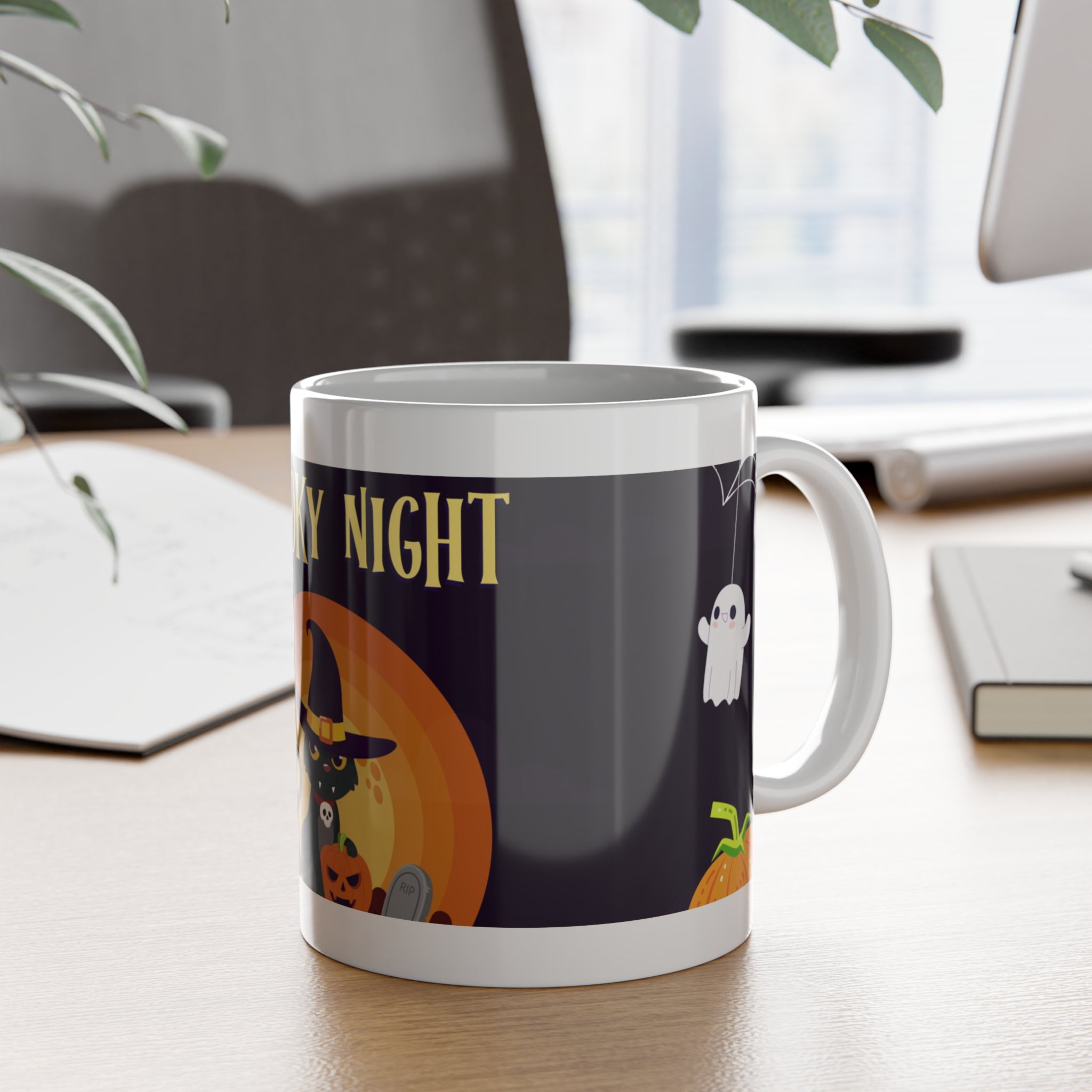 Spooky Night in a Creepy Graveyard | Halloween Black Cat, Ghosts, and Pumpkins | White Ceramic Mug - 11oz / White